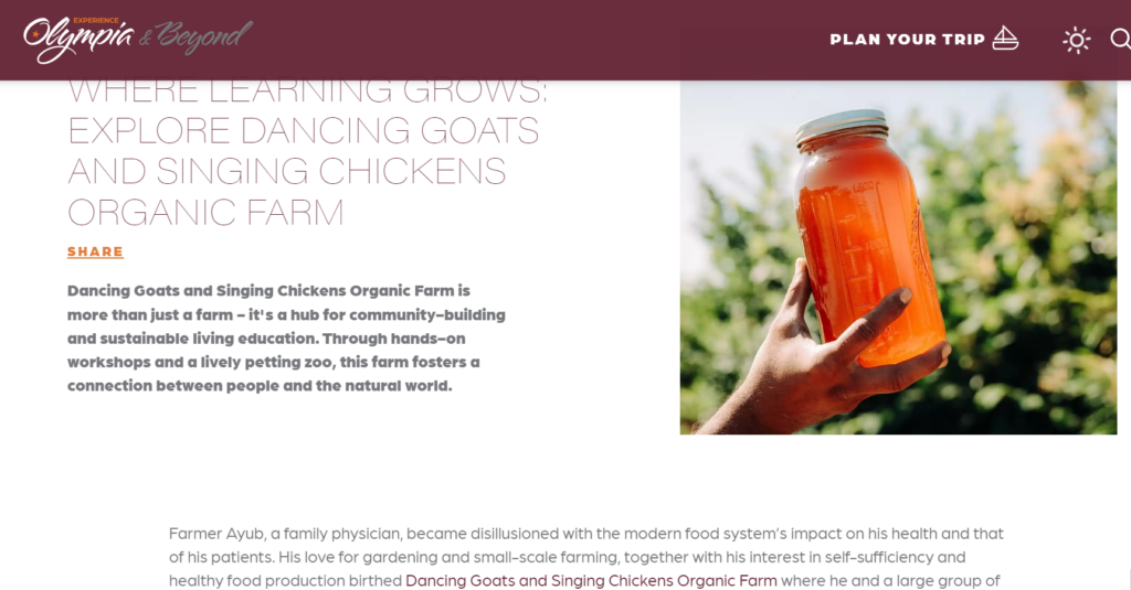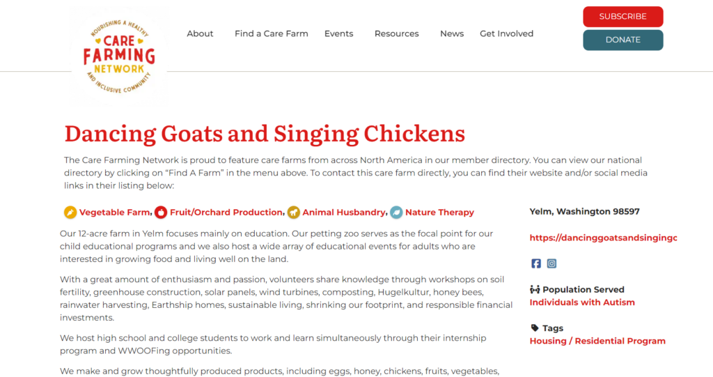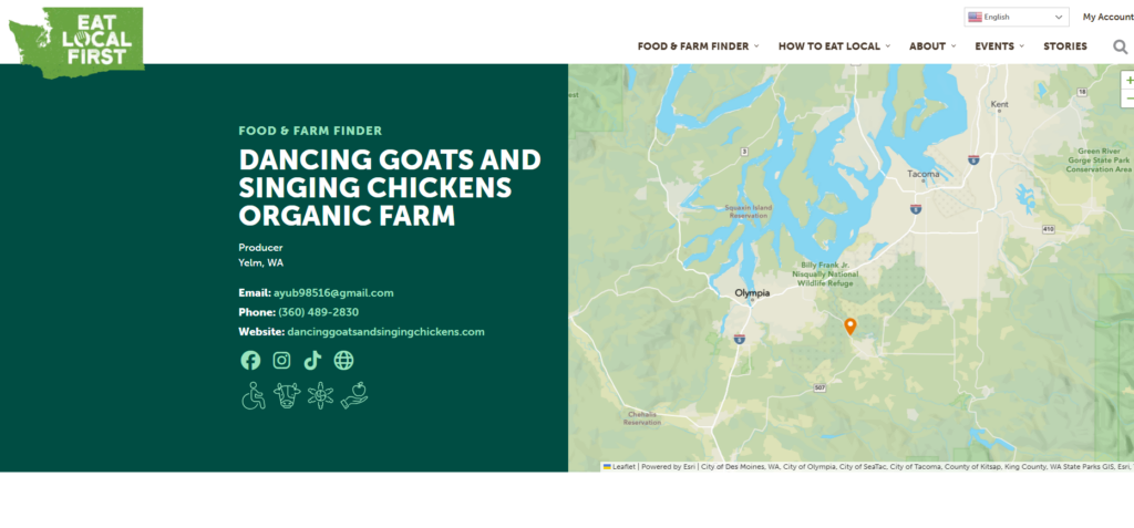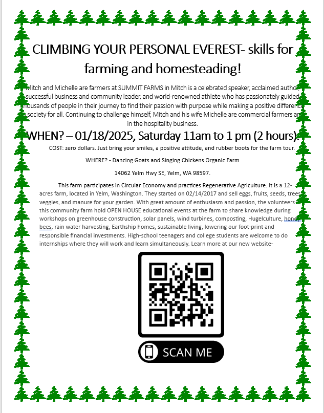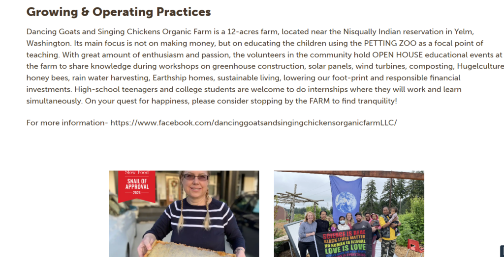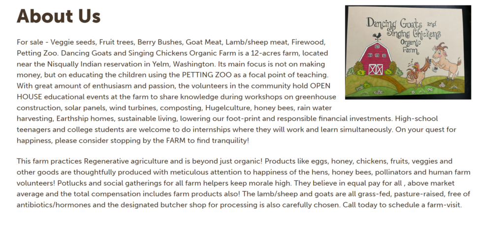 Dancing Goats and Singing Chickens Organic Farm is a 12-acres farm, located near the Nisqually Indian reservation in Yelm, Washington. Its main focus is not on making money, but on educating the children using the PETTING ZOO as a focal point of teaching. With great amount of enthusiasm and passion, the volunteers in the community hold OPEN HOUSE educational events at the farm to share knowledge during workshops on greenhouse construction, solar panels, wind turbines, composting, Hugelculture, honey bees, rain water harvesting, Earthship homes, sustainable living, lowering our foot-print and responsible financial investments. High-school teenagers and college students are welcome to do internships where they will work and learn simultaneously. On your quest for happiness, please consider stopping by the FARM to find tranquility!
