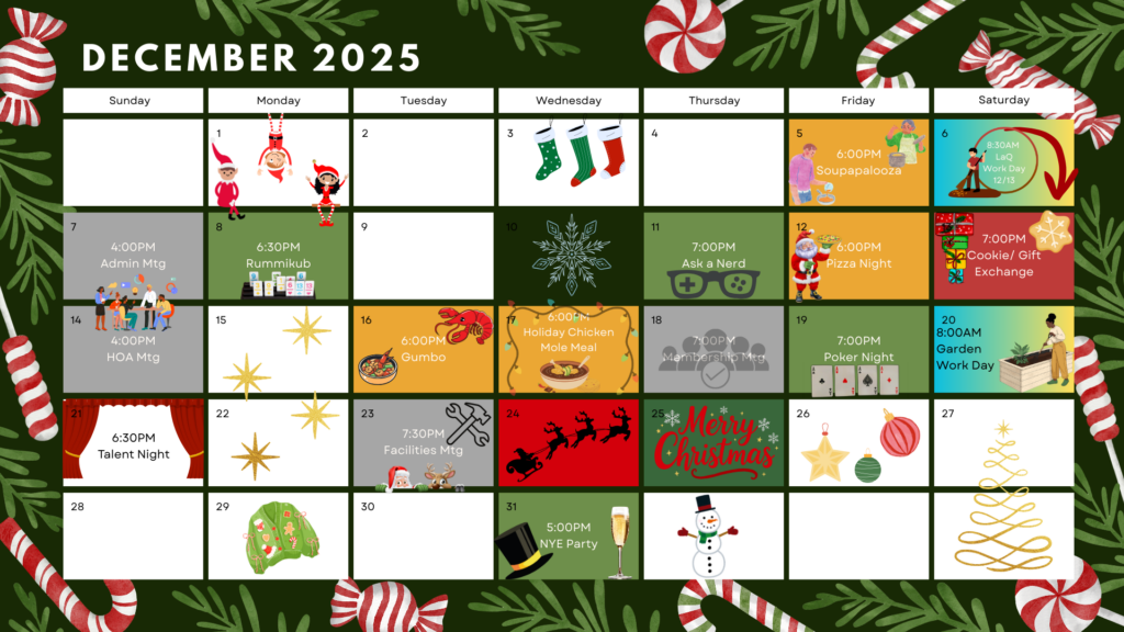 We have tours of our community the last Sunday of every month starting at 4:30PM at the Common House (CH). The CH is located in the Northeast part of our community across from our community garden. You will be greeted by a few community members, taken on tour of our community and end in a potluck where you can meet your potential neighbors and learn more about what intentional living means.