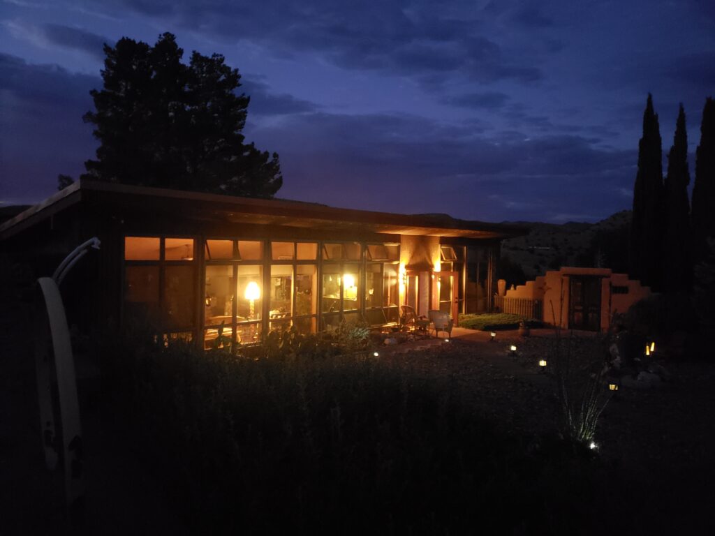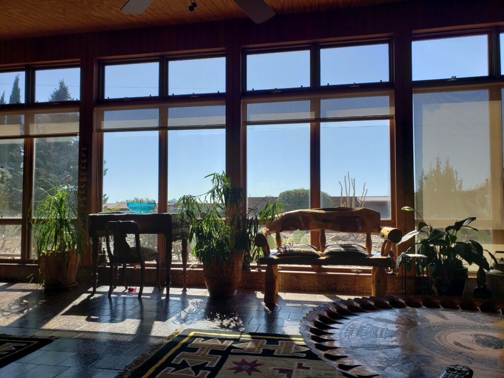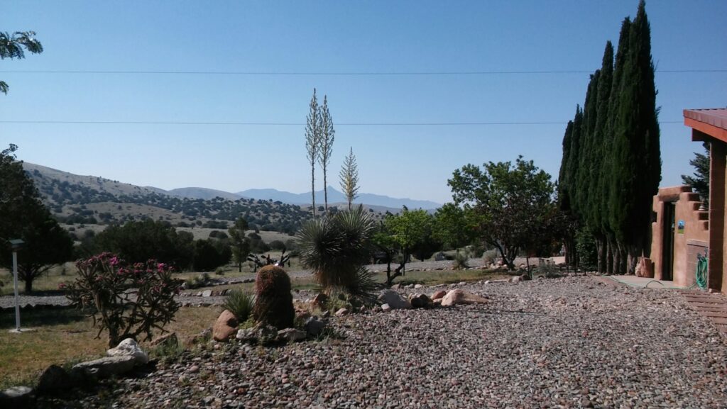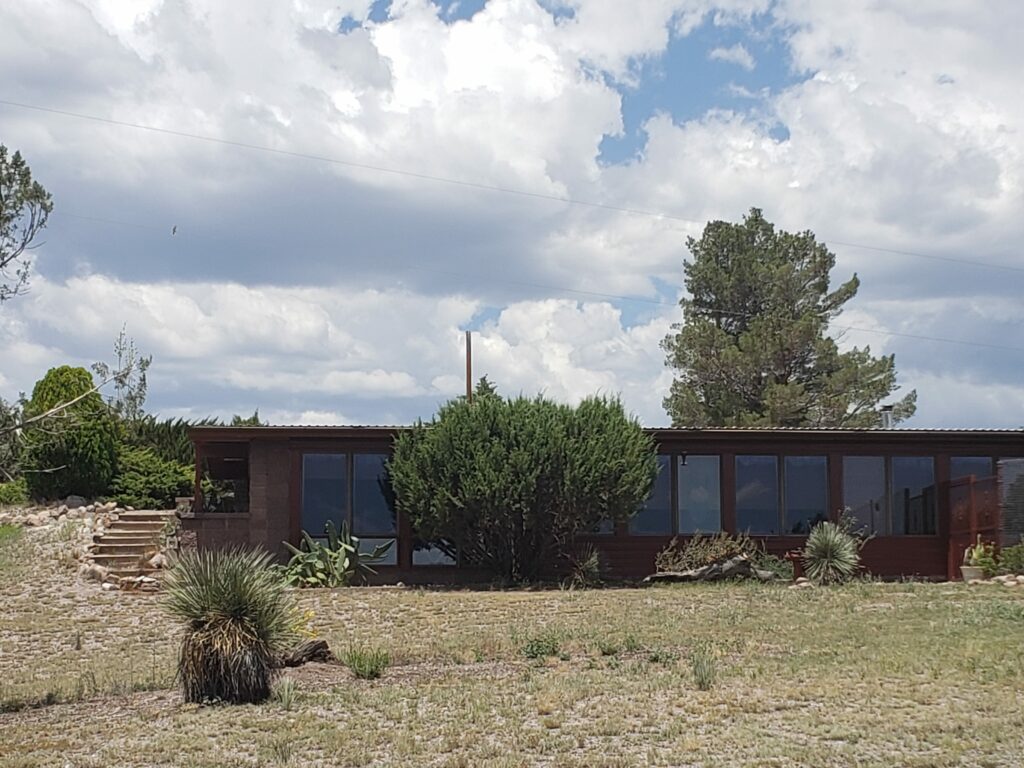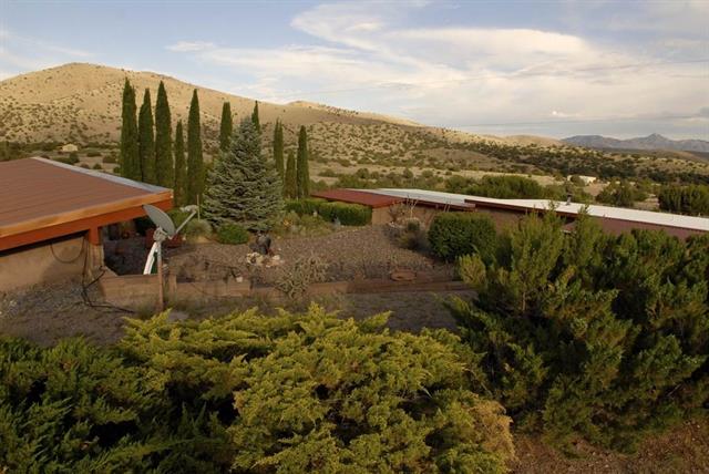 Walk through century old mesquite Mexican doors into the huge adobe walled courtyard connecting the two homes. Main house is one bedroom en suite, 1 & 1/2 bath, 12′ cathedral ceiling facing SW with stunning views of Cooke’s Peak, open floor plan with 9′ floor to ceiling opening windows southwest exposure, galley kitchen, Jenn-Air fridge, commercial gas range, dishwasher, granite countertops and granite composite sink, granite countertops and Mexican ceramic sinks in the bathrooms. Guest house has two bedrooms, 1 bath, pantry, wet bar, wood stove, game room and sunken hot tub. The two earth berm passive solar houses are very energy efficient, on demand gas hot water, heats only when needed, 500 gallon rainwater collection tank, gated compound. Guest house for friends and or family, an in law suite for parents or teenagers, a rental income, or an airbnb. This second house has a ‘safe room’ with a steel door, 2 car covered portal with iron gates, 2 car garage, shop with 220 electric, circular gravel driveway, deer fenced yard with mature fruit trees (apples, pears, cherry, apricot, plum & mulberry) and a dozen grapevines, raised gardens and fountains. There is a seasonal arroyo (creek), pad for RV parking and hook up and well with 3 acres of water rights. 1 mile to La Esperanza Vineyard and the Living Harvest Bakery / coffee house in San Lorenzo. Located a short, scenic drive to Silver City for shopping, restaurants, art galleries, doctors, hospital, Western New Mexico State University and the Grant County airport, 16 miles from the City of Rocks State Park. Beautiful property in the Mimbres valley, San Lorenzo, New Mexico where there is a take off and landing strip. Move to the country to enjoy this safe haven with a view to live for!
