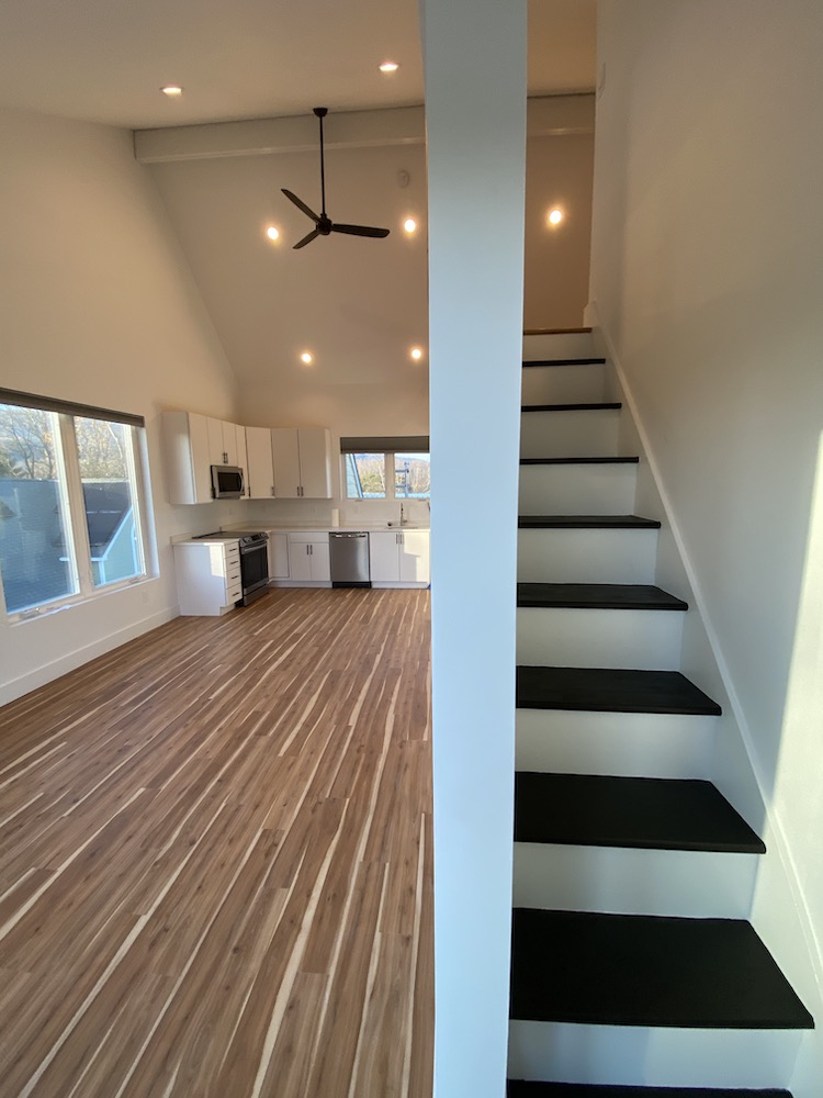This walkup condo completed in July 2021, has 2 bedrooms and 2BA plus a spacious modern living area with cathedral ceiling. It also has a bonus room/den/partial bedroom in the loft. A good-sized rooftop terrace provides spectacular mountain views.