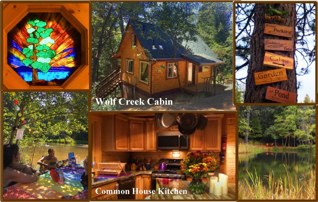 Along with your own cabin, you’ll also enjoy the Common House with wood fireplace, piano, large-screen TV, meditation/yoga loft, exercise room, playroom and launtry; the Art Barn with your own art/craft space; indoor “Grotto” spa hot-tub sanctuary; Massage Room; Organic Garden; Forest Trails; and Swimming Pond.