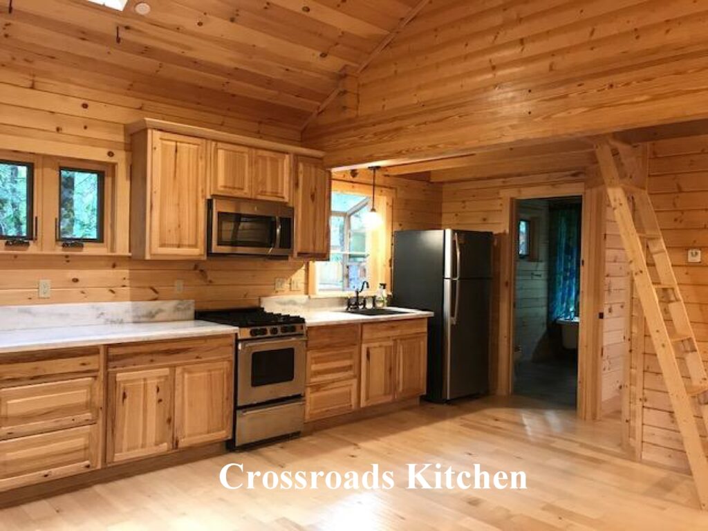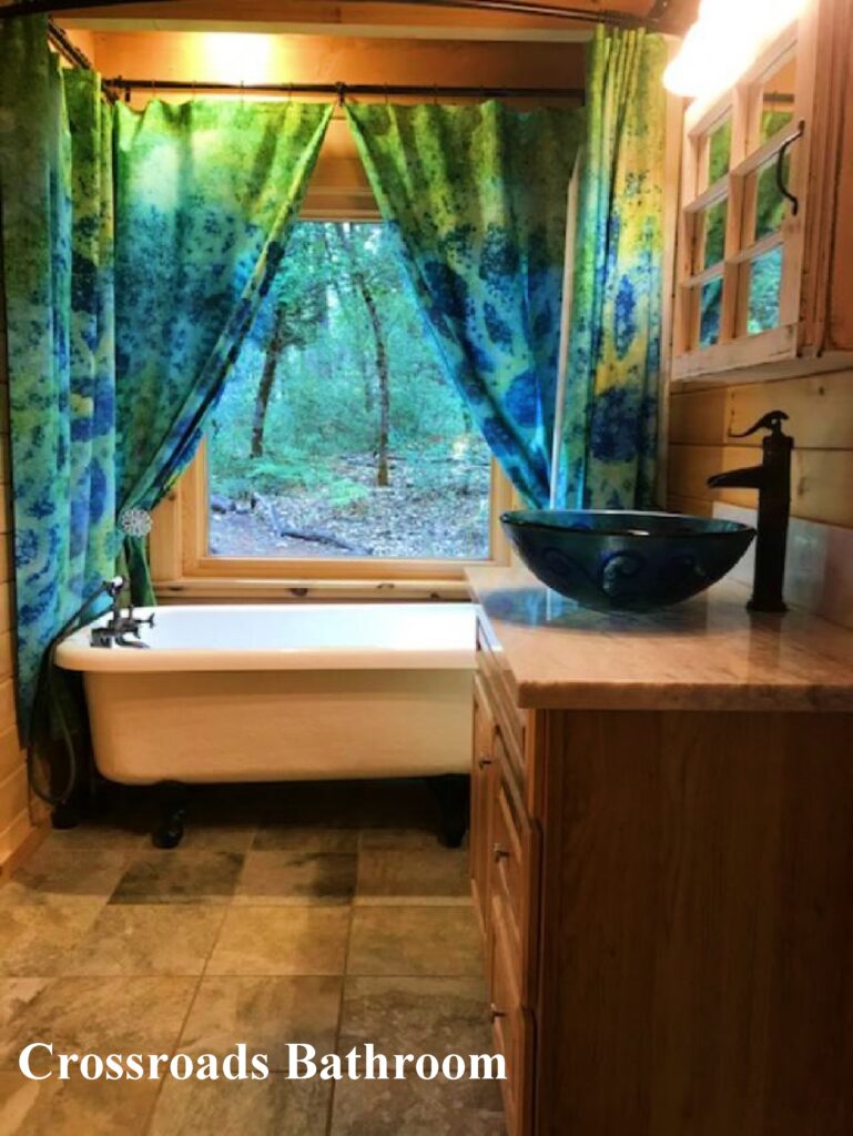 In each cabin there’s vaulted ceilings, wood floors, a kitchen with hickory cabinets and granite counter tops; bathroom with claw-foot tub, artisan vessel sink and hand-crafted vanity; a bedroom plus an extra full-sized loft; an open living room area with a propane “wood stove” type heater, a skylight and a beautiful and unique stained glass window.