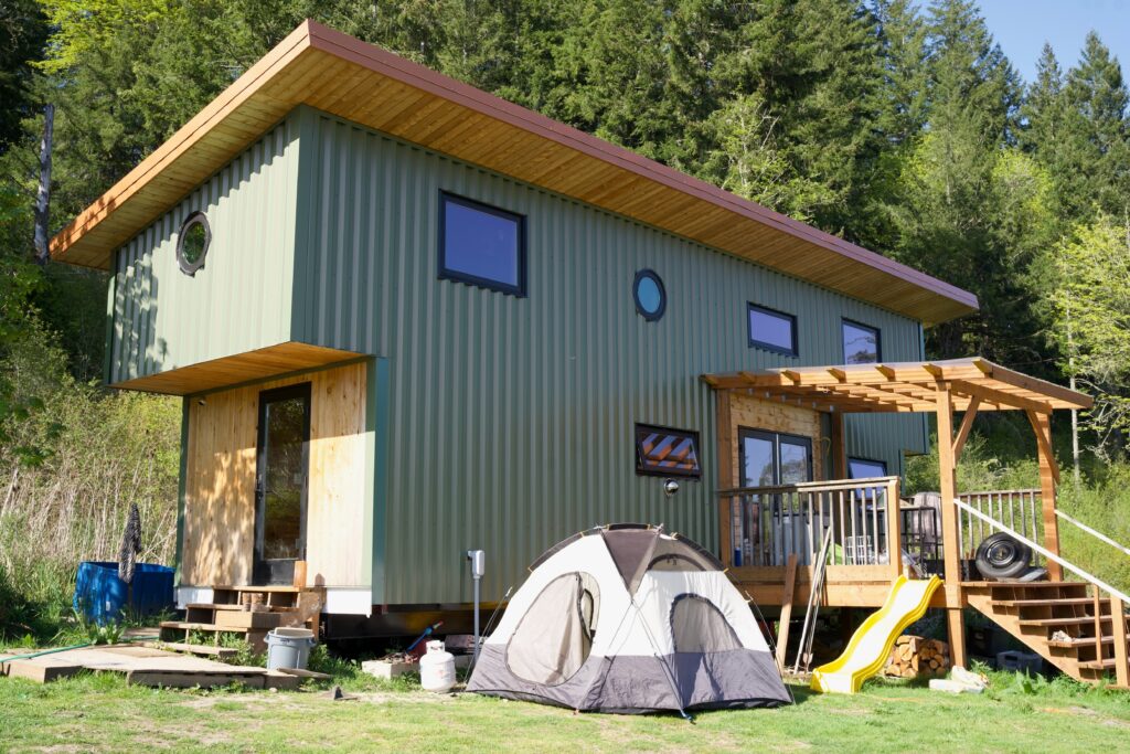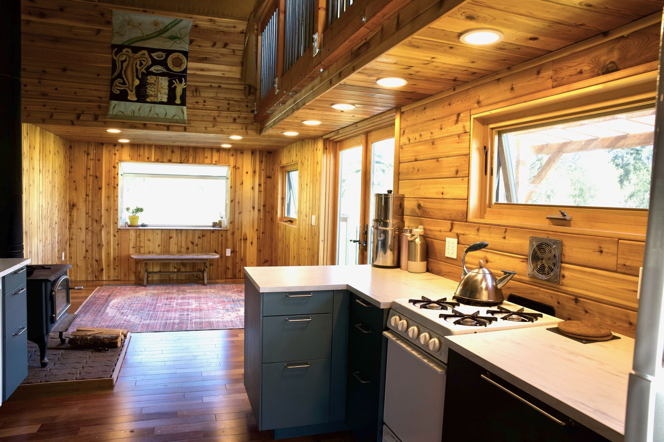 Beautiful giant tiny house on wheels – 400sq/ft home built for a family, featuring cedar tongue and groove walls, wool insulation, hardwood floors, tiled shower, passive solar design, double loft, covered deck, woodfire stove, and a new IKEA kitchen. Move in ready!