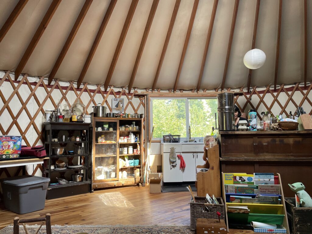 30’ Yurt with cedar flooring – a beautiful space for communal gatherings, yoga, or creative projects (needs some love but the structure is solid). Comes with a great wood stove and running water, attached covered shower space.