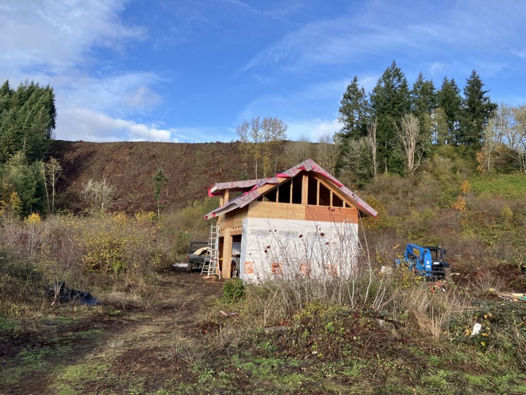 One cabin under construction – 400sq/ft, fully dried in, passive solar design, new doors/windows, 2×6 frame, loft with dormer, water at site, ready for you to build out the interior.