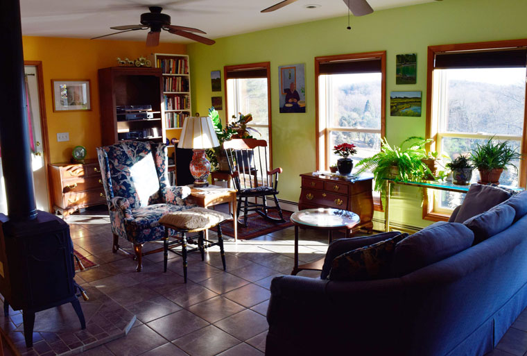 This house is in a brilliantly sunny location with terrific views. It features three bedrooms and two large bathrooms and is approx. 2200 sq. ft. The design is extremely energy efficient. Other features include: ceramic tile floors, a wood stove, a 10β² x 17β² composite deck, maintenance-free painted fiber cement weatherboard siding, solar panels, French doors, a natural gas-fired hot water boiler, community well and septic,Β and mature gardens.