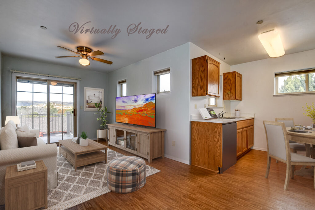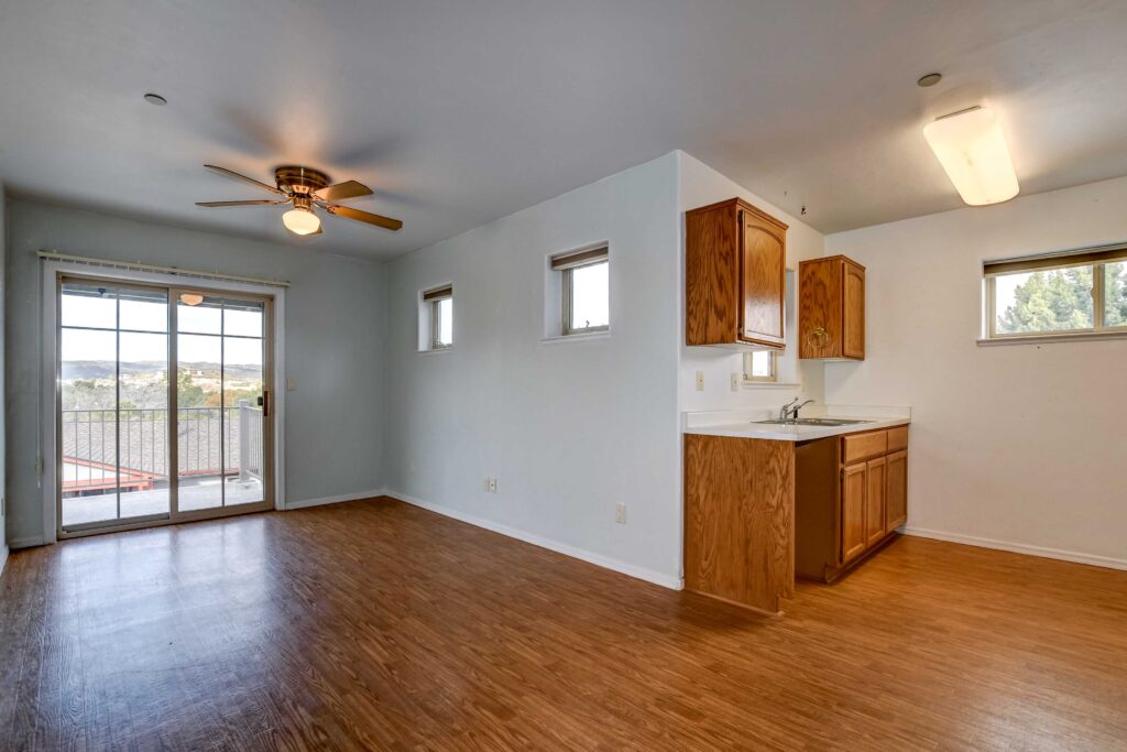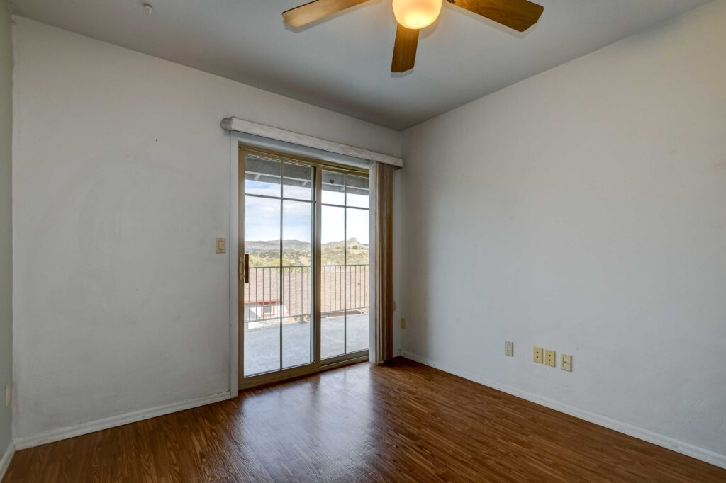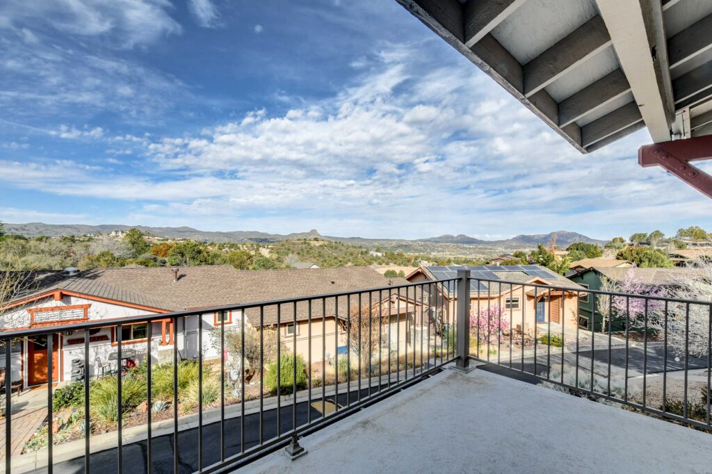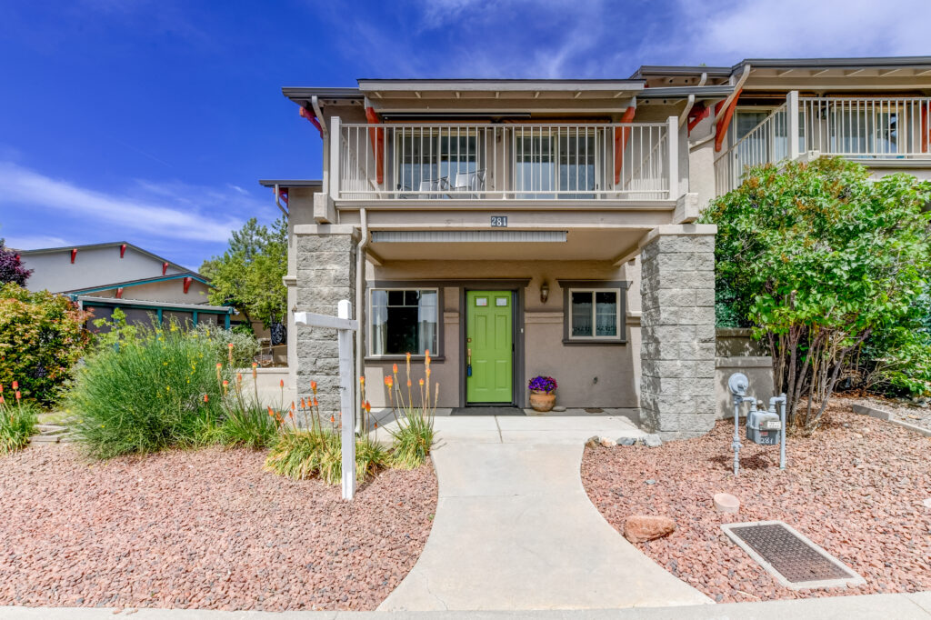 Cozy 2 level, craftsman-style home, in Manzanita Village ~ Prescott’s beautiful Co-Housing Community. Downstairs offers a covered front entry porch plus an open sunny patio, living room/kitchen combo, bedroom with a walk-in closet and a full bath. Upstairs is a spacious studio or family room with wet-bar, laundry, living room and bedroom. The upstairs patio boasts glorious views of Thumb Butte, Granite Mountain and downtown Prescott, a great place to spend cool summer evenings with family & friends. Many windows fill the space with natural light. Brand new roof! Adjacent to 8 acres of community owned open space. Walk to downtown Prescott and catch some dinner or some music on the Square or to nearby Acker Park.
