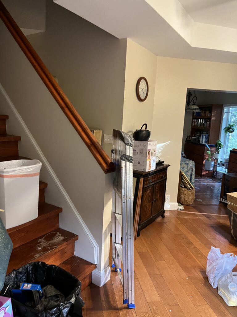 Rooms Upstairs for rent: one of the two Bedrooms are furnished with a queen bed (including linens), bedside tables, upholstered chair and small dresser & chest of drawers. The other room is unfinished. Each room has a large closet- approximately 6’.