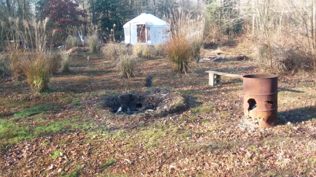 There is a large opening where the garden, solar array and cistern, open grass camping, horseshoes, firepit, and yurt are located just off the driveway through either of a pair of short paths from either end.