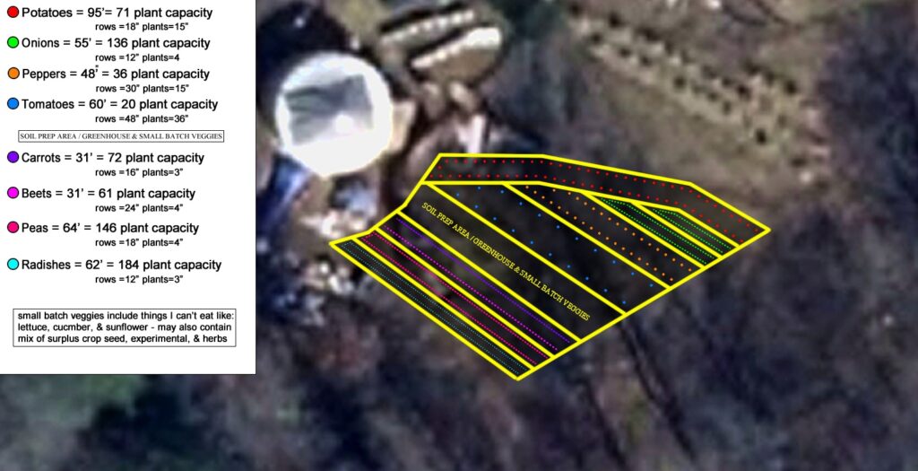 Planning and creation of a large garden including ways to reseed future crops from produce grown and methods feasible for off-grid long term food storage.