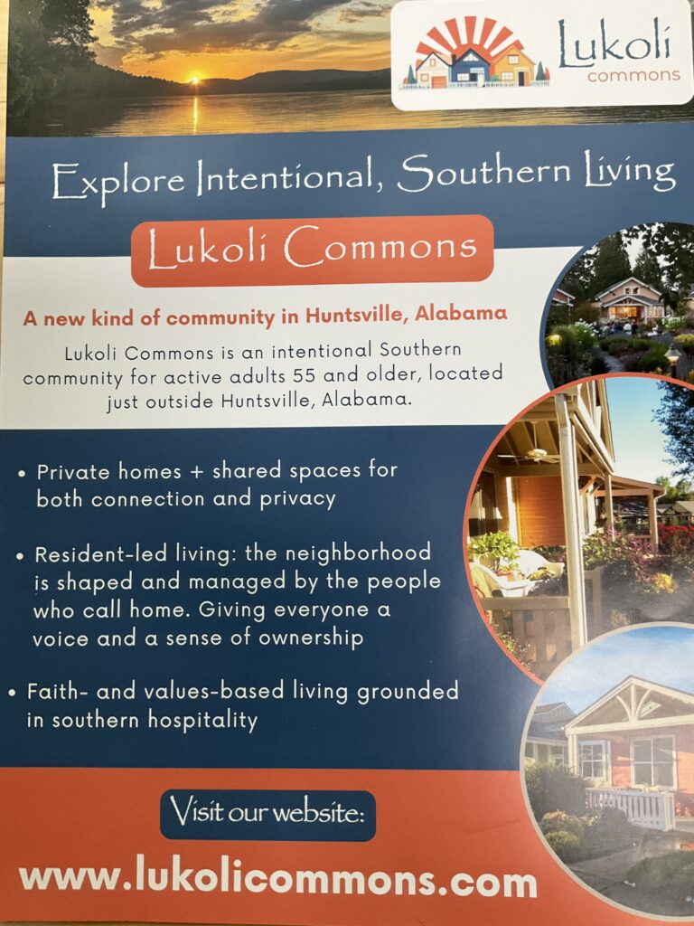 We are forming a 55+ active adult cohousing community near Huntsville Alabama, a beautiful location nestled in the Appalachian foothills. This will be a resident-led and planned community where the neighborhood is shaped and managed by the people who call it home, giving everyone a voice and sense of ownership. The community is made up of private homes and shared places for privacy but also providing connection through community events and a commons house for gathering. We are planning to incorporate an aging care plan for the members as they age in place.
