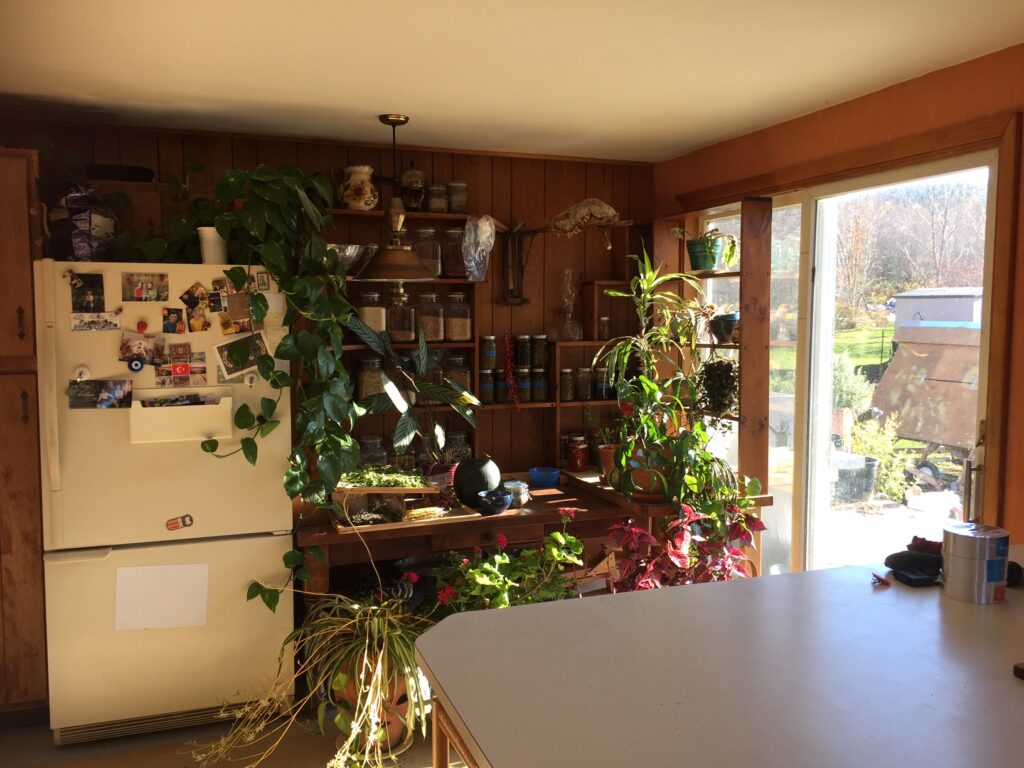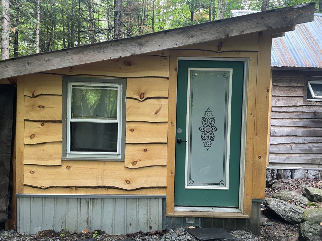 The 275 sf cabin is privately located in the woods about 250 feet from the main house which offers a small basement bathroom for toileting needs. The kitchen includes a propane stove, fridge, sink with water access, and a wall-mounted propane heater. The cabin has electricity and internet. The shared working basement contains a woodshop, cold room, seedling starting space, washer, and dryer. Asking price: $30,000.