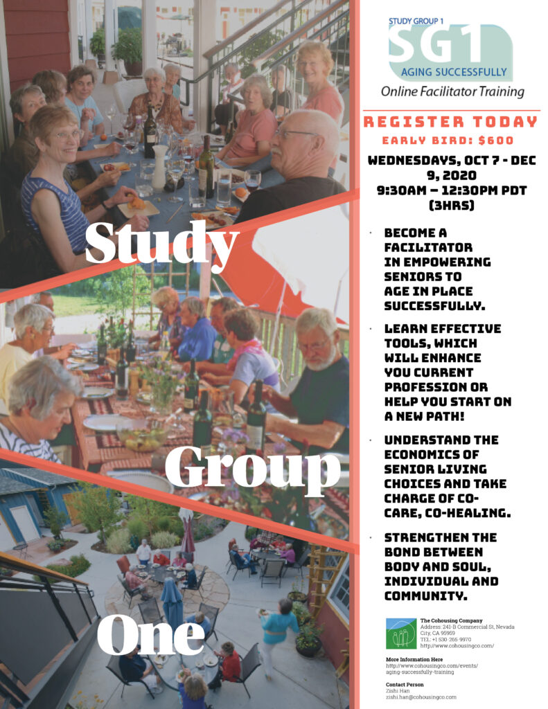 In these COVID times, architect and pioneer of senior cohousing in North America, Charles “Chuck” Durrett (Durrett Architects) worries about seniors now more than ever. This is no time to be isolated. Seniors in cohousing are socially distanced but not socially isolated. Between Tai Chi twice per day, assisting each other with groceries, prescription drugs, safe and distant but fun meals together and hundreds of other things, seniors look out for each other in cohousing in these times. They help people most at risks minimize their exposure to COVID. Therefore, Chuck is more motivated than ever to get more seniors into cohousing, into the good times, and into the heyday of community, so that when rough times like this occur, like these days, seniors are ready. The Study Group 1 (SG1) – Aging Successfully Facilitator Training helps seniors learn how to set their own lives and the lives of other seniors up for success. Please help Chuck help them. The SG1 Facilitator Training is for anyone motivated to be part of a solution in the current senior housing crisis in the U.S. and around the world. With your participation, we should be able to get a new senior cohousing started in your part of the world relatively easily.