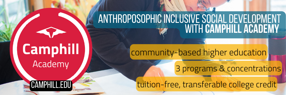 CALLING SOCIAL ARTISTS! Camphill Academy is accepting applications for fall 2024! At Camphill Academy, higher learning meets community living. Students can earn tuition-free, transferable college credit while living in one of 9 inclusive Camphill communities in the US. Camphill Academy offers 1-, 3-, and 5-year programs in Anthroposophic Inclusive Social Development, a field of work oriented towards transforming our communities to become inclusive of children, youth, and adults with intellectual disabilities. The curriculum features courses in agriculture, craft, education, disability studies, conflict resolution, visual and performing arts, inner work, anthroposophy, human development, and Goethean phenomenology.