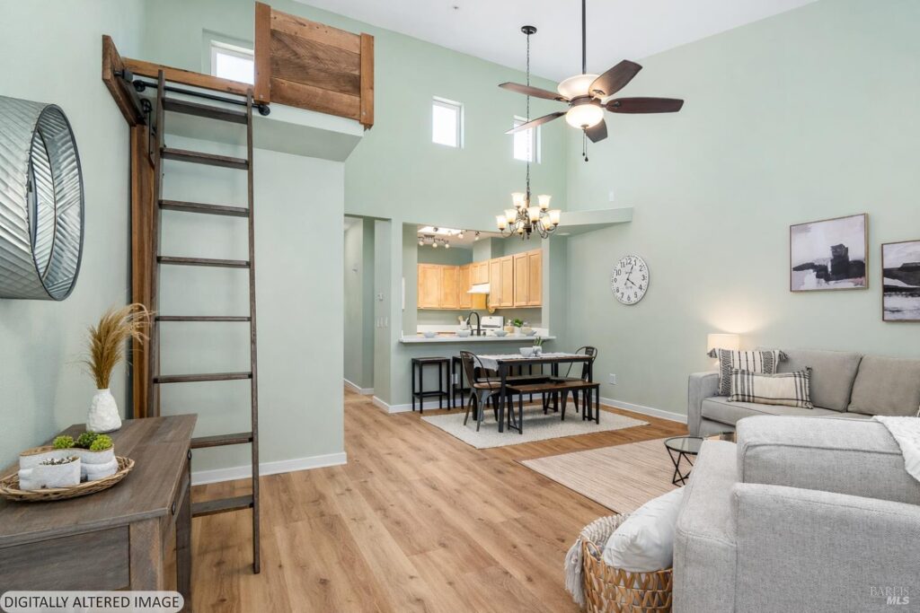 This upstairs, single level unit has an open and stylish design featuring two bedrooms, two baths, an office with built-in shelving and an in-house ladder leading to the bonus space loft. The home has been updated with bright and charming features including fresh paint, luxury vinyl plank flooring with radiant heat, and in-unit washer/dryer. The kitchen has a custom hammered copper sink, breakfast bar, and new stainless steel stove. Bedroom views of Mt Bennett and convenient location near shopping, Howarth, Spring Lake and Annadel parks. Schedule a visit to learn if Yulupa CoHousing offers the home and lifestyle for you! Contact Cynthia at 707 592-9833 or Sheila 707 775-7973