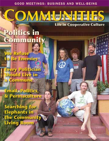 - SEARCHING FOR REPUBLICANS…AND OTHER ELEPHANTS IN THE COMMUNITY LIVING ROOM: A Politics in Community Survey – An informal survey raises several compelling questions: Can communitarians learn to focus on larger-scale politics as much as on internal politics? Should they? What’s proper political etiquette in community? And have you ever met a communitarian who is not left of center? by Chris Roth