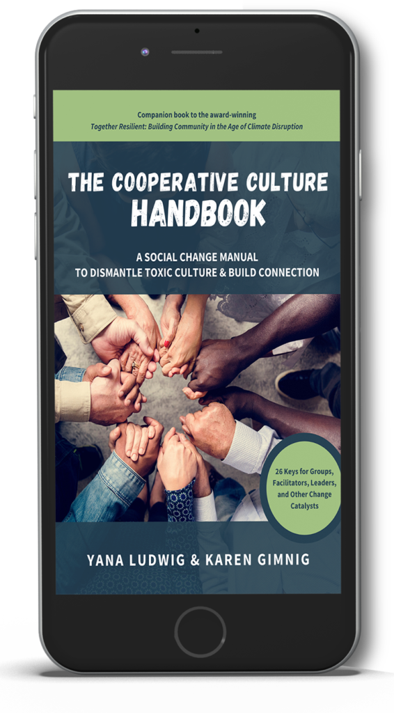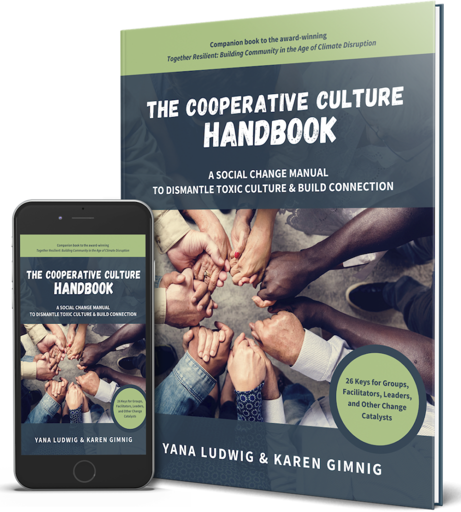 The Cooperative Culture Handbook was written as a companion to author Yana Ludwig’s earlier book Together Resilient: Building Community in the Age of Climate Disruption. Together Resilient examines why citizen-led, community-based action is key to addressing our world’s greatest problems. The Handbook offers a framework and practical toolkit for how groups can solve such problems.