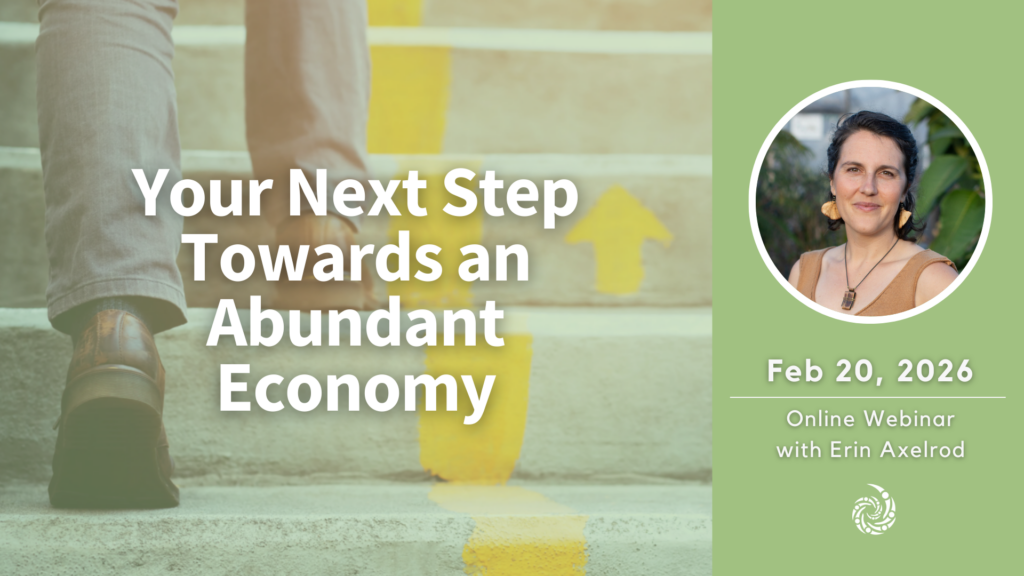 Whether you live alone, in a rural or urban intentional community, or in cohousing- Erin’s “Next Step” resource will meet you where you are, and help you map out your next step towards an abundant economy.
